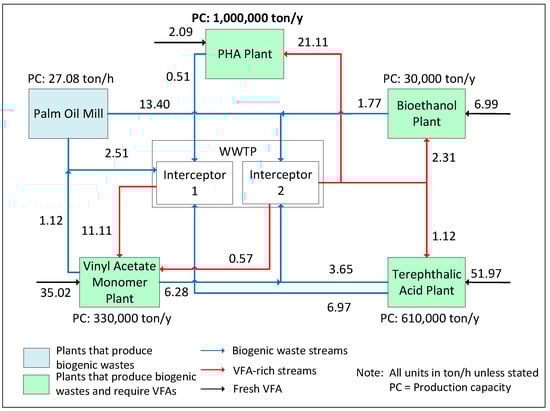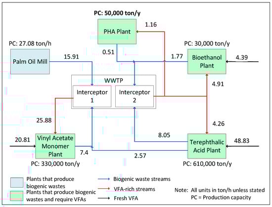 Moreover, in a BWB EIP, the wastes generated from one industry can be utilized by other industries. While an EIP emphasizes material exchange, it also focuses on energy exchange within the participating plants, resulting in economic benefits for all involved. For instance, in the Kalundborg Eco-industrial Park, the residual heat produced in the manufacturing process is used to distribute heat to businesses and households in the city of Kalundborg []. However, this paper presents the material exchange, mainly VFA. Thus, it is recommended to analyse the BWB EIP with a more comprehensive approach including water integration specifically to recover the useful nutrients in wastewater. In addition, the economic and environmental feasibilities of the BWB EIP are necessary to be carried out.
