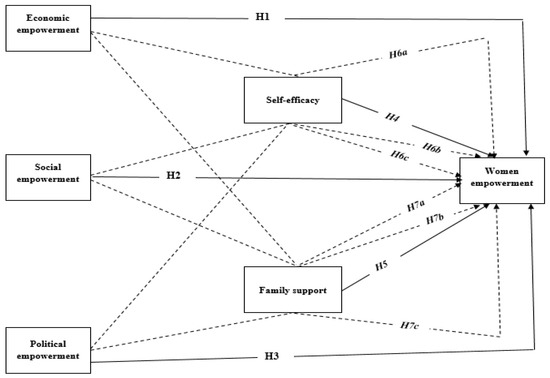 In Middle Eastern countries, Ref. [20]’s empirical insightfulness underlines a predictive precision of leadership support and government support on WE. In addition, family capital and business ethics make a significant contribution to WE. In Saudi Arabia, WE improves economic growth in the long term [65]. The economic growth is supported by FS and empowers the creation of self-employment opportunities. Knowledge and technical education are possible among women through FS [33]. In the social and cultural context, Ref. [32]’s findings support the positive roles of self-esteem, where the husband’s support and social support have a psychological effect on WE. The constructs, such as family environment, FS, legal and political environment, awareness of information and internal motivation significantly improve PE [14]. Therefore, the researchers formulated the following hypothesis: