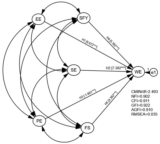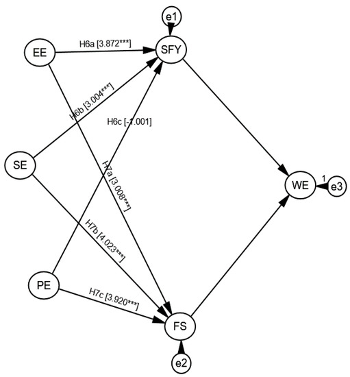 Figure 3. Path Analysis [indirect paths]. (Source: Researchers’ own estimation). Note(s): EE = economic empowerment; SE = social empowerment; PE = political empowerment; SFY = self-efficacy; FS = family support; WE = women empowerment. *** p < 0.05.