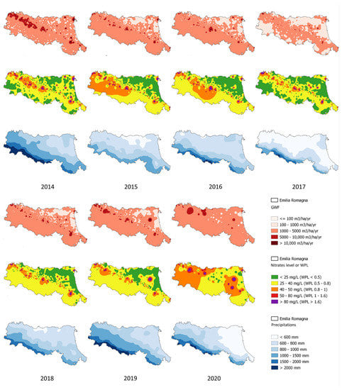 Table 3 shows the number of sites exceeding the limit concentration of 50 mg/L for nitrates in the period from 2014 and 2020 and the nitrate concentration of the 95th percentile. From 85.3% to 90.8%, the wells have nitrate concentration below 50 mg/L, with a nitrate concentration of the 95th percentile between 60 mg/L and 75.05 mg/L. Despite concentration values offering a good general view of pollution level alerts in the entire region, the WPL and GWF provide a better perspective about the actual concern about the anthropic activity. The WPL has been calculated using data collected from ARPAE related to the 2014–2020 period as the study conducted in the Apulia region (Italy) [,]. Table 4 shows the GWF, WPL, Q, and precipitation data obtained for the years from 2014 to 2020; moreover, it shows the percentage of the number of sites for which an N surplus (Lsur) has been estimated considering the average agricultural use and the detected concentrations. From the obtained results, the effect of increased rainfall seems to be related to the intensification of N leaching: a correlation of 0.94 between the precipitations and average annual Ltot was obtained. Some authors [,,] showed that rainfall intensification increased deep percolation, altering soil moisture patterns. The effects of rainfall can potentially modify N cycling and losses and microbial dynamics, including mineralisation as well as plant N dynamics, N uptake, and productivity, all of which could affect soil N availability for loss [,]. In 2020, despite an increase in N fertiliser application, a lower N surplus, WPL, and GWF was obtained. These lower results could be associated with the reduced contribution of non-agricultural anthropogenic activities. In fact, the agricultural sector in Italy did not stop during the lockdown period imposed by the Italian government []. In Figure 2, geospatial data of nitrate concentrations, WPL, GWF, and annual precipitations for the years from 2014 to 2020 are reported, obtained with an inverse distance weighting method of interpolation (WPL and GWF) and with a triangulated irregular network method (precipitations), with each map constructed with grouped areas with the same value based on distribution quintiles each represented with different colour gradations.