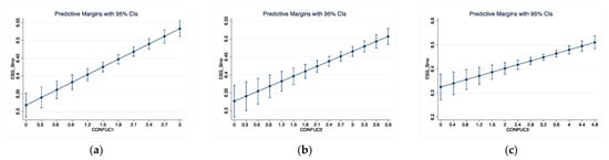 Average marginal effects of local Confucian culture on ESG performance. (a) Predictive margins as a function of CONFUC1. (b) Predictive margins as a function of CONFUC2. (c) Predictive margins as a function of CONFUC3.