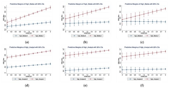 We plotted the interaction effects of attention in Figure 2. The regression models used in the margins plot graph are the same as in Table 4. As seen in Figure 2a–c, the “High_Media = 1” lines are steeper than the “High_Media = 0” lines, indicating that the effects of Confucian culture on firms’ ESG ratings are stronger in firms with higher media coverage than that with lower media coverage, vividly supporting Hypothesis 2. We also plotted the interaction effects of analyst coverage in Figure 2. As seen in Figure 2d–f, the “High_Analyst = 1” lines are steeper than the “High_Analyst = 0” lines, indicating that the effect of Confucian culture on firms’ ESG ratings are stronger if firms are followed by higher numbers of analysts, which also supports Hypothesis 2.