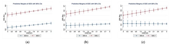 We plotted the interaction effects of property rights in Figure 3. The regression models used in the margins plot graph are the same as in Table 6. As can be seen in the figure, the slope of “SOE = 1” line and the “SOE = 0” line show no difference in Figure 3a, whereas the “SOE = 1” lines are steeper than the “SOE = 0” lines in both Figure 3b,c, indicating that the effects of Confucian culture on firms’ ESG ratings are stronger in SOE firms than that in non-SOE firms, which generally supports Hypothesis 4.
