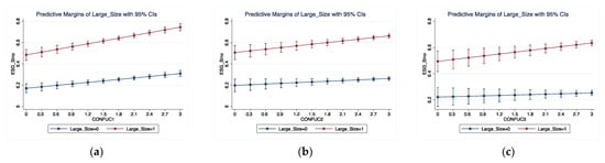 We plotted the interaction effects of firm size in Figure 4. The regression models used in the margins plot graph are the same as in Table 7. As seen in Figure 4a–c, the “Large_Size = 1” lines are steeper than the “Large_Size = 0” lines, indicating that the effects of Confucian culture on firms’ ESG ratings are stronger in large firms than in small firms, vividly supporting Hypothesis 5.