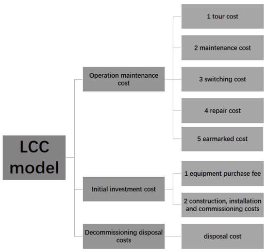 As shown in Figure 4, in this study, we divided the LCC model cost of the equipment into initial investment cost (including equipment acquisition cost, installation cost, and commissioning cost), operation and maintenance cost (cost for inspection and maintenance and repair to ensure the safety and availability of the equipment, which can be subdivided into tour cost, switching cost, repair cost, earmarked cost, and self-operating cost) and decommissioning and disposal cost (the value of equipment that can be recycled at the end of its life and the disposal cost that may be incurred in disposing of the equipment).