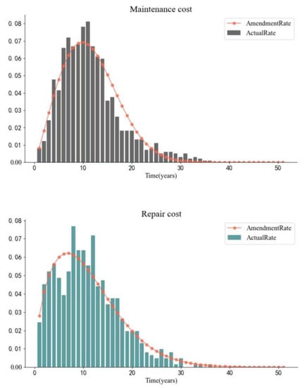 - Differing from previous studies, the MC–AHABi–LCC model proposed in this study uses Isolated Forest (IF) to screen outliers for cost data and a Welbull distribution for the probability correction of the revised dataset to make the results more accurate. Using random simulation instead of the traditional method of directly calculating the average cost in LCC can provide a more rational explanation of the “small probability” of incurred costs, which better reflects the reality of the “randomization” of operation and maintenance costs. While retaining the overall characteristics of the original dataset, the “personality” of each cost can be considered, which makes the selection of the economic life of LCC more flexible and closer to the actual production situation.
