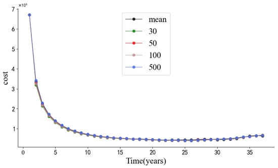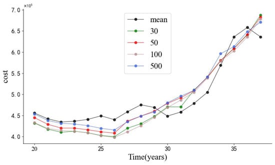 As shown in Figure 9, the mean is the average annual cost calculated by the traditional LCC method. The traditional LCC method calculates the cost by averaging the average repair cost incurred in different years and different service periods. The results of the four random simulations are close to the mean, so it is impossible to directly judge which random simulation presents the best effect. To better present the research effect, the average annual LCC obtained from 20 to 37 years is shown in Figure 10, which follows Figure 9.