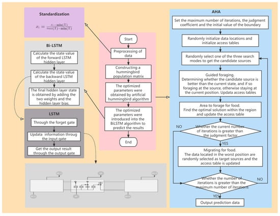 For the processed data, this study adopted the Bi-LSTM algorithm for prediction. To enhance the accuracy of prediction results, the artificial hummingbird algorithm was used to optimize Bi-LSTM parameters. The number of parameters set for the input layer, connection layer, and hidden layer of the AHA–Bi-LSTM algorithm in this method was 3, 1, and 10, respectively. To ensure the rationality of the benchmark test, the parameters of the Bi-LSTM, LSTM, and GRU comparison algorithms were set as described above. The flowchart is shown in Figure 11.