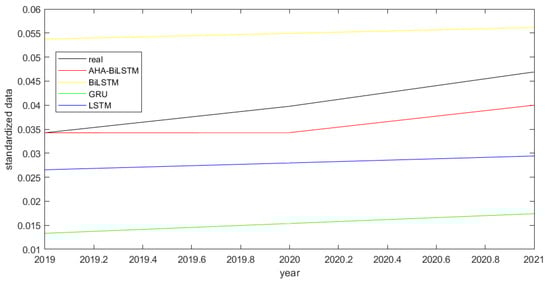 In Figure 12, the black curve is the true value from 2019 to 2021, the red curve represents the predicted value obtained by the AHA–Bi-LSTM algorithm adopted in this study, the yellow curve is the Bi-LSTM algorithm, the GRU is the green curve, and the LSTM is the blue curve. The red curve is the closest to the true value curve, followed by the LSTM algorithm represented by the blue curve, while Bi-LSTM and GRU had poor prediction effects. Therefore, the AHA–Bi-LSTM algorithm was an appropriate selection for use in prediction.