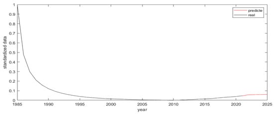 Table 2 shows that the MAE of the AHA–Bi-LSTM algorithm was improved by 71.84% compared with that of the Bi-LSTM algorithm. Compared with the GRU algorithm, its MAPE value increased by 93.13%. Compared with the LSTM algorithm, the value of RMES was improved by 60.65%. Through the judgment of the three error indexes, the prediction effect of the AHA–Bi-LSTM algorithm on each index was good and was the most effective prediction method, which indicates that the method could effectively predict the average annual O&M cost data. Therefore, this algorithm was used to predict the data for the next four years; the standardized results of prediction are shown in the following Figure 13.