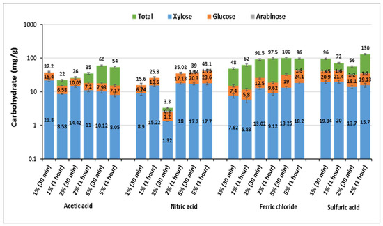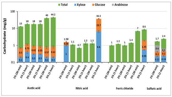 For the reference study (1% H2SO4), the total carbohydrate content for the 30 min treatment was estimated as 1.7 mg/g of biomass, which included more than 50% monomers (glucose—0.22 mg/g of biomass, xylose—0.2 mg/g of biomass, and arabinose—0.6 mg/g of biomass). For the 1 h treatment, the recovery of total carbohydrate was 2.4 mg/g of biomass with glucose, 0.2 mg/g of biomass with xylose, and 0.2 mg/g of biomass with arabinose. Compared to the other treatments used in this study, only acetic acid could solubilize the carbohydrates in a low concentration (1% and 2%). Hence, acetic acid proved to be an effective treatment method for the hydrolysis of algal biomass.