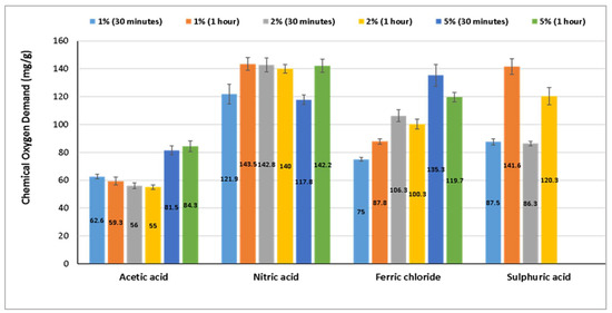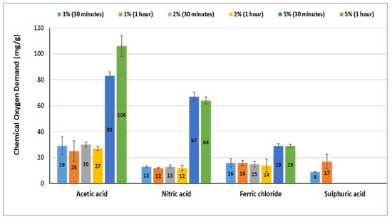In the nitric-acid-treated hydrolysate, COD was very high, which showed that nitric acid was very effective in the dissolution of COD compared to other chemicals such as acetic acid and ferric chloride (Figure 6). Higher soluble COD illustrates higher solubilization of organic matter [54]. For the reference study, the soluble COD (Figure 6) did not show any significant change with an increase in the reaction time. Results of the present study correlated well with Pin et al. [43], who examined the effect of different pretreatment times (between 1 h and 3 h) on the hydrolysis of water hyacinth and concluded that there were no significant differences in the yield due to the changes in the duration of pretreatment.