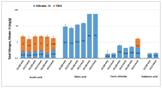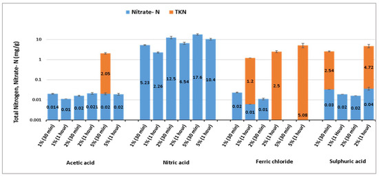 The total nitrogen in this study (Figure 3) comprises Nitrate-N and TKN-N. TKN (TKN is used to express TKN-N from this point onward) was estimated only for samples that showed enhanced sugar recoveries. The nitrate-N content for the acetic acid-treated hydrolysate was very low, i.e., between 0.2 and 0.3 mg/g of biomass, and TKN was estimated to be approximately 2 mg/g of biomass. For nitric acid, the value of nitrate was found to be higher in all hydrolysates because of the presence of nitrogen (as nitrate) in the hydrolyzing reagent itself. Therefore, TKN analysis was not performed for the nitric-acid-treated hydrolysates.