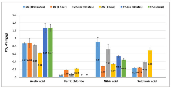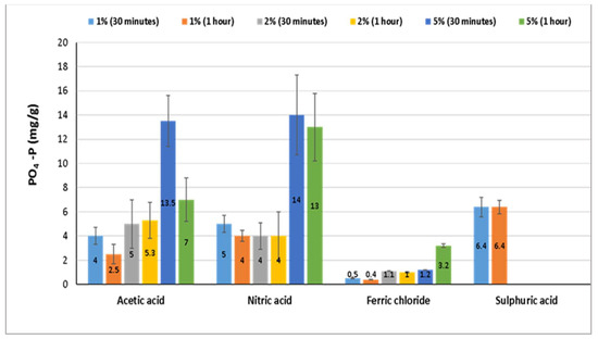 For the reference study (1% H2SO4), the orthophosphate content was 6.4 mg/g of biomass for both the 30 min and 1 h treatments.