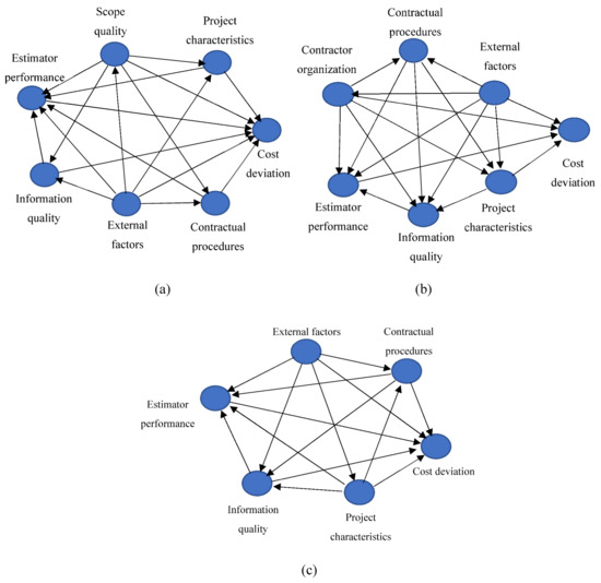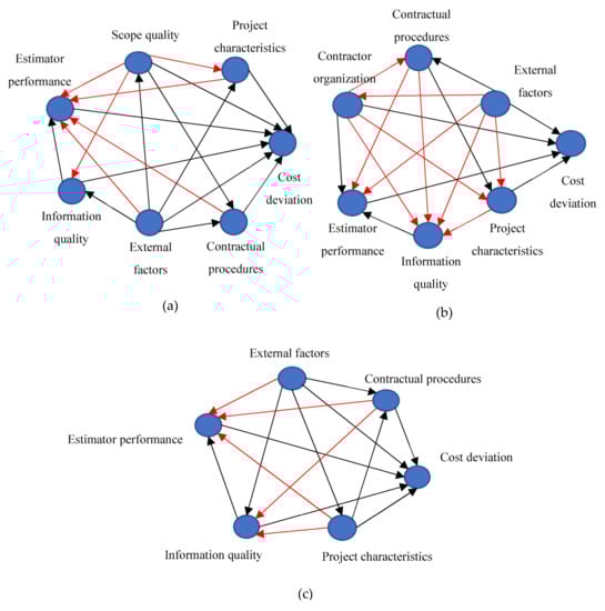 The three models: (a) client–consultant model, (b) contractor model, and (c) common model (insignificant relationships are indicated by red arrows).