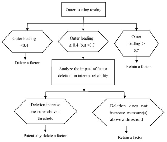 In terms of convergent validity, the construct reliability coefficients are functions of the outer loading of the affecting factors. To examine the significance of factors in their groups, the outer loading of a factor (l) was studied. If l was more than 0.7, the factor was retained in the model. On the other hand, when l ranged from 0.4 to 0.7, the influence of the deletion of the factor on the composite reliability of the group factor was studied. A factor was deleted if the deletion led to an increase in the composite reliability of the group. However, when there was no increase in the composite reliability of the group due to the deletion of the factor, the factor was retained in the model. These steps are shown in Figure 5. The Cronbach’s α and composite reliability () were computed using Equations (1) and (2) [25], respectively, as follows:
