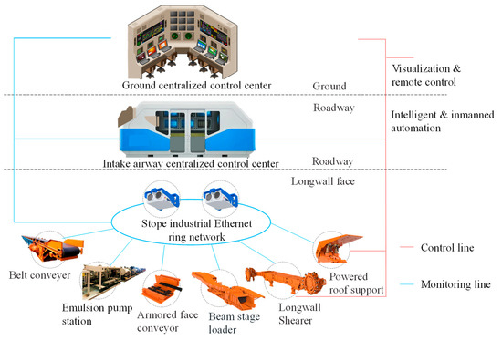 During the twelfth Five-Year Plan (12th FYP) period (2011–2015), the China Coal Technology & Engineering Group Corp (CCTEG) and several coal enterprises had collaborated to develop the first-generation intelligent coal mining technology, i.e., memory cutting and remote video monitoring and controlling. The mining conditions detected by various sensors and commands issued by miners are transmitted between the longwall face and control center through the Industrial Ethernet Ring Net. The technological framework of this technique is shown in Figure 1 [20]. The system consists of three parts: coal mine commanding center, roadway monitoring and controlling center, and integrated mining machinery. The coal mine commanding center acts as an integrated visualization and controlling platform, whose functions include inputting monitoring data, displaying machinery and mining dynamic, and sending overall controlling commands. The roadway monitoring and controlling center is in the intake airway. The function of this center is to monitor and control mining machinery, which includes the automation of shearer, powered roof supports, face conveyor, etc. The integrated mining machinery coordinates with each other to realize the whole process of coal mining, including coal cutting and transportation, dust capturing, roof supporting, and other operations.