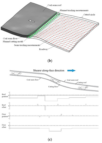 (2) The second step is to establish a big data analysis/decision platform to guide coal mining. The tasks of the platform include the following three (Figure 2b): (i) amending coal seam model-based extraction profiles, coal interface, and seam tracking measurements obtained during the mining process; (ii) generating the cutting model based on the seam model and mining scheduling; and (iii) implementing accurate machinery control, fault self-diagnosis, and production decision-making based on historical production data and artificial intelligence.