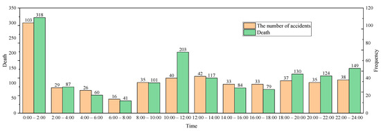 For most of the coal mines, the working hours of morning, middle, and evening shifts are 8:00–16:00, 16:00–24:00, and 0:00–8:00. Middle and evening shifts are the production stage in which the main work is coal mining and roadway excavation. The general work of the morning shift includes machinery maintenance and quality standardization. Figure 3 shows the statistics of accidents and fatalities on different periods of time. Most of the deadly accidents and deaths happened during the rest periods, for example, from 00:00 to 4:00, from 12:00 to 14:00, and from 20:00 to 24:00. If the working shifts are changed to be more suitable for physiological rest rules, it is reasonable to believe that the deadly accidents would fall.