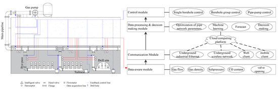 The abovementioned issues tend to reduce the gas drainage efficiency and limit the utilization of gas resources, as well as some disasters, such as pipeline gas explosion and coal and gas outburst. Therefore, Zhou (2019) proposed the concept of intelligent and accurate gas drainage, which aims at ensuring that the system operates safely, efficiently, and with low energy [41]. The gas drainage strategy, which includes the pipeline network and air pump working power, is optimized dynamically based on a pipeline network optimization algorithm; automatic valves; and the monitoring data, including negative pressure, gas flow and concentration, and valve opening data. The framework of intelligent and accurate gas drainage is shown in Figure 6. It consists of data-aware, communication, data-processing and decision-making, and control modules.