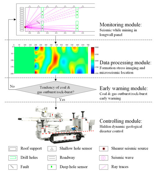 The monitoring module is a seismic while mining observation system [42]. Microseismic signals induced by working shearer and cracked rock mass are received in real time.