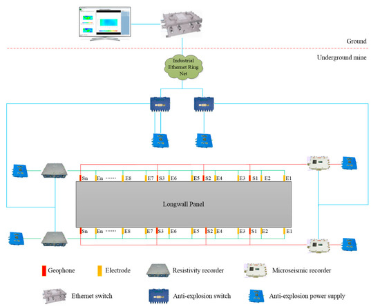 Topological diagram of microseismic and resistivity monitoring system in longwall panel.