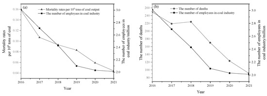 The trends of the numbers of employees in coal industry in large coal mines, the mortality rates per 106 tons of coal output (a), and the number of deaths (b) from 2016 and 2021.