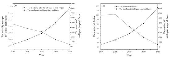 The trends of the numbers of intelligent longwall faces, the mortality rates per 106 tons of coal output (a), and the number of deaths (b) from 2017 and 2021.