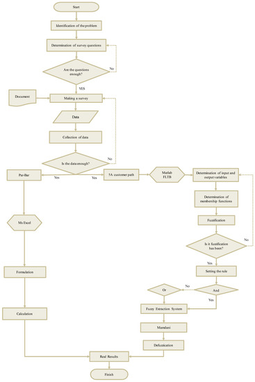 The new coronavirus disease which first appeared in Wuhan, China, in December 2019 was named COVID-19 [93,94]. Before the first case was seen in Turkey on 11 March 2020, various precautions were taken by following the cases and developments in the rest of the world. After April 2020, curfews/restrictions were imposed, sometimes covering only metropolitan cities and sometimes the whole country. With the suggestion of health officials, the obligations of mask–distance–hygiene started to be implemented in the country as per the state policy. During the whole pandemic process, especially in March-April 2020, while the sales of products such as surgical masks, cologne, hand disinfectants, and hygiene/cleaning products peaked, there were cases where the products were out of stock. Consumers’ preferences in their products (significantly increasing the demand for hygiene products) and their purchasing habits have changed with the pandemic. Therefore, it has been necessary for businesses to make changes in their marketing strategies to adapt to these new habits in customers. This study provides data on how a brand operating in the cleaning products industry acts at the points on the 5A customer path where it can communicate with customers and how this has changed with the pandemic, and whether this has been affected by the COVID-19 pandemic will be analyzed. Since these data are linguistic and contain uncertainty, the fuzzy logic approach, which processes uncertain knowledge, was used while evaluating them. Unlike the 5A customer path studies in the literature, the present evaluations of the touchpoints on the 5A customer path were made using the fuzzy logic approach for the first time. The rule-based fuzzy logic approach wasused to identify weaknesses at touchpoints in the 5A customer path. The rule base consists of 3137 rules, which is quite large compared to fuzzy logic applications in the literature. The summary flowchart of the application is shown in Figure 3.