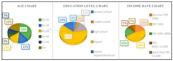 A customer portfolio was created with the participation of 300 people living in the region where the brand’s company is located (60% of the participants were female, and 40% were male). The age, education, and income levels of the participants are shown in Figure 4.