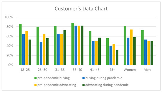 While some of the data collected by the questionnaire consist of demographic data, the rest consist of customer responses to be used in the third phase of the application, the fuzzy logic application. The graphs drawn according to the data obtained from the questionnaire results are shown in Figure 5 and Figure 6. With the pandemic, purchasing rates in the questionnaire results were expected to decrease due to the decrease in purchasing power, the choice of substitute products in cases where access to the product was complex, and the decrease in shopping due to curfews. Figure 5 shows the purchasing and brand advocacy rates before and during the pandemic according to age and gender. Highlights in the chart are that the number of purchases increased in the 31–35 age range, the advocacy rate for the 36–40 age range remained the same, and the advocacy rate for the 41–45 age group increased during the pandemic. The purchasing rate of female customers decreased by 24%, and the advocacy rate decreased by 16%. The most crucial result observed in male clients is that their advocacy rates remained constant.