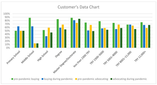 Figure 6 shows the purchasing and brand advocacy rates before and during the pandemic process according to the education and income level categories. Highlights in the chart are that the advocacy rate remained the same. Furthermore, the purchasing rate of those with a primary school education level remained the same, the advocacy rate remained the same for those educated to secondary school level, and the advocacy rate in customers with master’s and doctorate degrees increased. There was no change in the purchasing rate for customers with an income level of TRY 8001–11,000, and the advocacy rate in customers earning above TRY 12,500 showed an increase of 9% (exchange rate for the questionnaire period: EUR 1 = TRY 10.46).