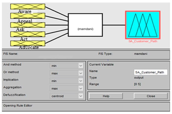 In the third part of the application, the 5A customer path touchpoints of the brand considered weak were determined. The rule-based fuzzy logic approach was used to make this determination. In the model created by using five inputs (aware, appeal, ask, act, and advocate) and one output (5A customer path) variable, linguistic variables expressing five different situations for each of the input variables (i.e., always, usually, sometimes, rarely, and never) were defined, and 3137 rules containing all possibilities were determined. Rule-based fuzzy logic applications created with many linguistic variables and rules are not typical in the literature. This study differs from other studies because it has many rules and is the first fuzzy logic application in this field. This study used the Fuzzy Logic Toolbox (FLT) of the MATLAB program, the preferred software of fuzzy logic applications. First, the answers to the 5A customer path questions obtained through the questionnaire were added to the FLT database. For fuzzy logic application, triangular membership function, the MFIS, “and” conjunctions for rule generation, and a value range of 0–5 were determined. In Figure 7, the interface prepared in the FLT is shown.