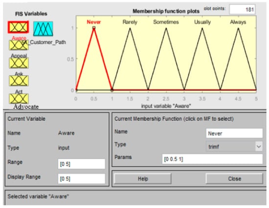 Figure 8 shows the linguistic variables with the five value ranges we determined when we looked at the awareness input. These variables are never, rarely, sometimes, usually, and always—i.e., the possible answers to our questions in our questionnaire. Our triangular membership function was determined as “trimf” for our awareness input. The input parameter values were determined after a few trials so that each linguistic variable corresponds to its range.