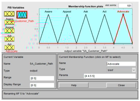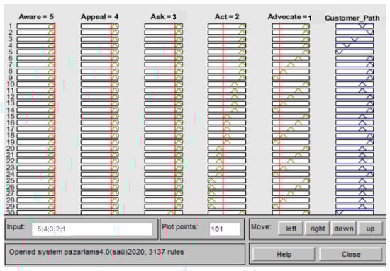 After the awareness input value, the attractiveness, curiosity, purchasing, and advocacy input values were added. As with the awareness entry, the value ranges for the other four inputs were between 0 and 5. The outcome of the problem is shown in Figure 9. The 5A concept was added to our program as a customer path. The output values ranged from 0 to 5, as with the input values. The membership function of the output was determined as the triangular membership function “trimf”, the membership function in the input. The output parameters consisted of the 5A customer path touchpoints. According to the study results, the weak point of the brand among these parameters could be determined, and the most suitable parameters for awareness, attractiveness, curiosity, purchasing, and advocacy were determined.