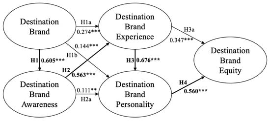 The SEM results show that the brand has a significant influence on brand awareness, brand experience and brand personality. Brand awareness has a positive impact on brand experience and brand personality. Results also show that brand experience directly influences both brand personality and brand equity, and brand personality is significantly related to brand equity (see Figure 3). As several scholars indicate [,,,,], this study also confirms that DB is considered to have a significant influence on DBA (Hypothesis 1). Similar to Yang et al.’s [] study, DB has a significant impact on DBE (Hypothesis 1b), and DBP has a significant influence on DBE (Hypothesis 4). In common with Dedeoğlu et al.’s [] study, this study confirms that DBA has a significant influence on DBP (Hypothesis 2a), and DBP has a significant impact on DBE (Hypothesis 4), which shows the relationship to be partially significant as in Veasna et al.’s [] study. In addition, the findings of Barnes et al., [] and Kumar and Kaushik [] suggest that various dimensions of DBExp have a varied influence on destination brand identification, which subsequently affects both tourists’ trust (DBP in this research) and loyalty (DBE in this research) toward tourism destinations. The findings from New Orleans, Louisiana (USA) confirm significant relationships between other DB items and DBExp (Hypothesis 1a, 2, 3 and 3a).
