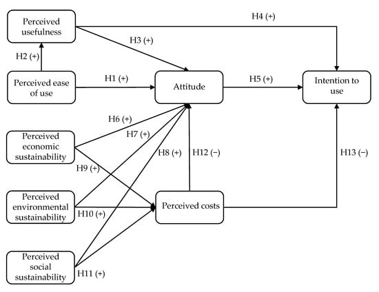 Ozaki [] also postulated that, in addition to convenience aspects, consumers’ perceptions of higher costs for a sustainable choice are an important factor in consumer decision-making. Higher prices for a product or service negatively influence consumer preferences and reduce the probability of a purchase decision []. In the context of sustainability, costs negatively affect consumer attitudes [], and lower perceived costs have been shown to increase purchase intention, e.g., []. Price perception is crucial for new technologies that are adopted in the last-mile, such as electric vehicles, meaning that higher price acceptance leads to higher usage intention []. Studying the acceptance of electric vehicles, Park et al. [] and Jayasingh et al. [] demonstrated a negative influence of perceived costs on intention to use. In line with these findings, we propose the following:
