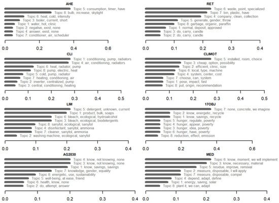 In the question on the electricity saving systems used, the most important item was 5, referring to the use of timers. In relation to waste removal, the most important items were 6, referring to the use of clean points, and 7, related to the use of containers for plastics. Regarding air conditioning systems, themes 1 and 4 indicated that air conditioning systems, hot/cold pumps and radiators were the most used; the air conditioning system used tended to be the one already installed in the center (theme 5). As theme 5 indicated, the cleaning products used tended to be ordinary detergents; it was not common to know whether these products were environmentally friendly. Respondents were not aware of the 17 Sustainable Development Goals (theme 7) nor were they aware of the goals of the 2030 agenda (theme 4), postponing their implementation to the future (theme 6) (Figure 2).