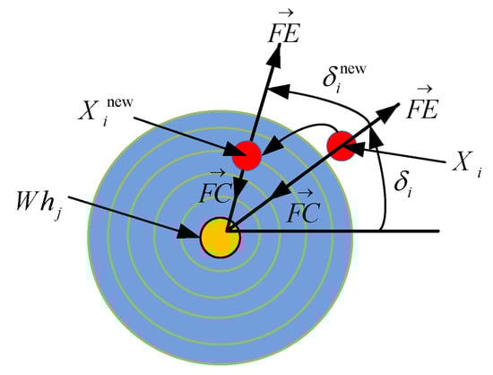 However, there are still some deviations brought about by extra whirlpools, as determined by their relative positions (Wh-Whj) and objective values (f ( ), which cause some deviations (∆Xi). Figure 1 depicts the impact of these whirlpools on their collection of objects and particles, leading to a new position for the ith particle equal to Xinew = Whj − ∆Xi. Figure 1 shows how objects and particles travel around their whirlpool’s center while keeping their distinct angle (δ).