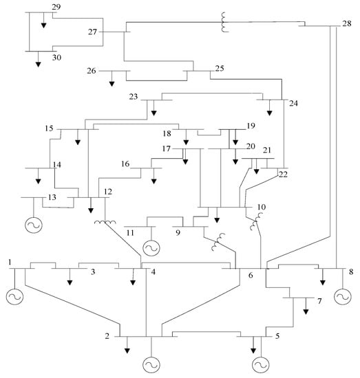 What is seen in Figure 4 demonstrates this. OPF operation simulations are performed with an active load of 283.39 MW and a reactive load of 126.18 MVAr using the IEEE 30-bus test system. The essential parts of an IEEE 30-bus test system are as follows: The 41 lines of transmission include 9 shunt VAR compensators on buses 10, 12, 15, 17, 20, 21, 23, 24, and 29, and 4 off-nominal tap ratio transformers on lines 6–9, 6–10, 4–12, and 28–27.
