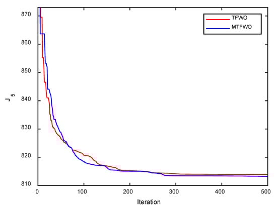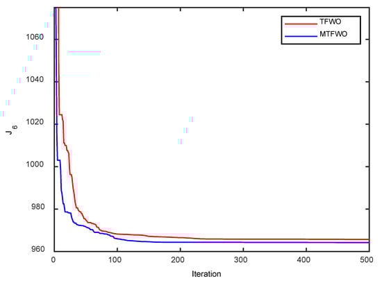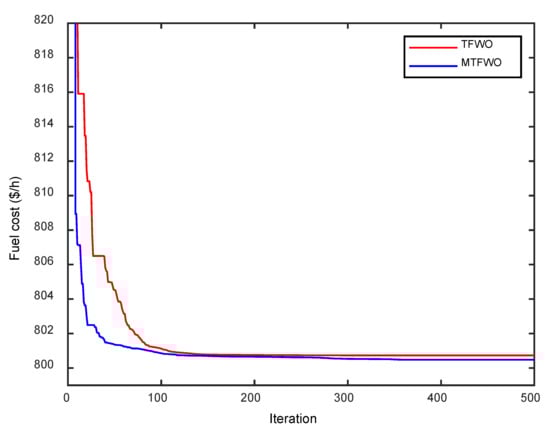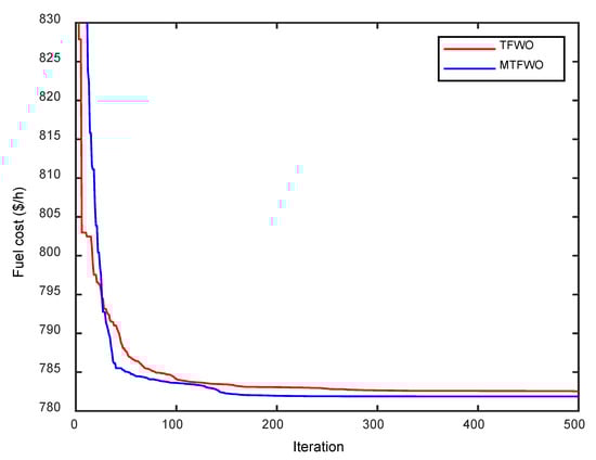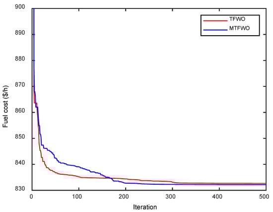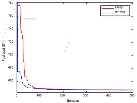 The presented figures represent the best results from 30 repetitions of each test. All requirements have been satisfied, and the outcomes are in line with the intended uses. With the aforementioned control variables fine-tuned, the overall fuel cost for Case 7 was drastically lowered in comparison to the first run of the TFWO algorithm. A contrast between the convergence characteristics of TFWO and MTFWO for Case 7 is shown in Figure 11.