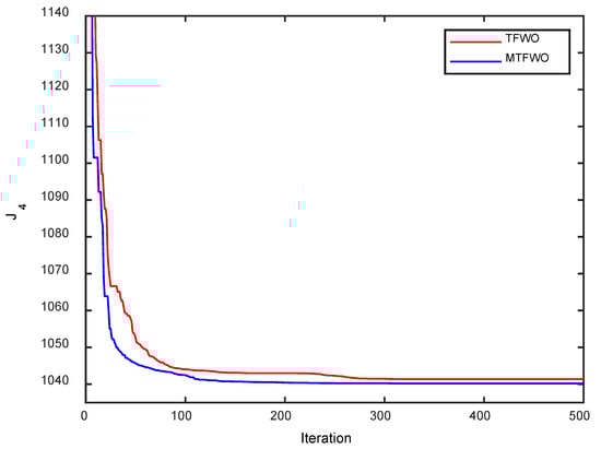 Based on experimental results in Table 2, the fuel cost using MTFWO is 800.4781 (USD/h) which is less in comparison to the optimization approaches in Table 2, which shows solutions using a variety of existing optimization methods, including a flower pollination algorithm (FPA) [26], MHBMO [20], hybrid shuffle frog leaping algorithm (SFLA) and simulated annealing (SFLA-SA) [27], hybrid modified particle swarm optimization (PSO) and SFLA (MPSO-SFLA) [28], hybrid phasor PSO (PPSO) and GSA (gravitational search algorithm) (PPSOGSA) [25], MSA [26], JAYA [29], firefly algorithm (FA) [30], manta ray foraging optimization (MRFO) [31], Aquila optimizer (AO) [32], adaptive real-coded biogeography-based optimization (ARCBBO) [33], hybrid of imperialist competitive algorithm (ICA) and TLBO (teaching-learning-based optimization) (MICA–TLA) [34], tabu search (TS) [35], artificial bee colony (ABC) [36], hybrid FA and JAYA (HFAJAYA) [30], hybrid PSO and GSA (PSOGSA) [37], modified Gaussian bare-bones ICA (MGBICA) [38], adaptive group search optimization (AGSO) [39], DE [40], moth-flame optimization (MFO) [26], evolutionary programming (EP) [41], GWO [14], stud krill herd algorithm (SKH) [42], and TFWO. Figure 5 shows the dramatic decrease in per-mile fuel costs.