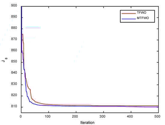 Approximately 20 USD per ton in Ctax is predicted [60]. Table 10 displays OPF results as estimated by the carbon price and anticipated output of wind turbines and solar generators. Table 10 shows that the quality and stability of solutions achieved with the suggested MTFWO are improved over those obtained with the traditional TFWO approach. There is an increase in the penetration of wind and solar electricity in comparison to Case 7 if a carbon price is contemplated (Case 8) and imposed (Case 7). Furthermore, Figure 12 displays the convergence qualities of these distinct approaches. Compared to traditional TFWO, there is little question that the suggested MTFWO yields superior solutions and converges to the faster optimal solution. Taking into account stochastic aspects such as WT and PV productions, these statistics demonstrate that MTFWO can handle very complex OPF situations.