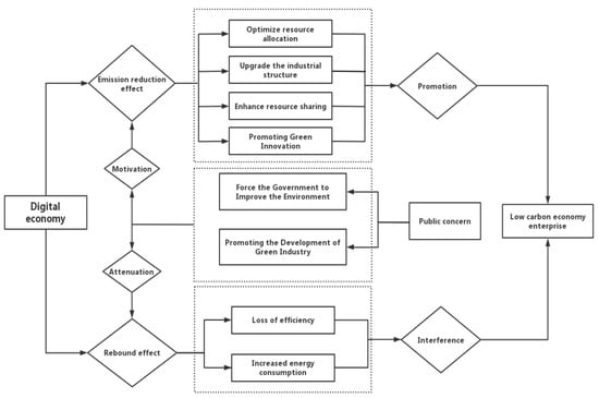 This paper argues that the digital economy has both an emissions reduction effect and a rebound effect on the low-carbon transformation of cities. On the one hand, the digital economy can promote the low-carbon transformation of cities by optimizing resource allocation, upgrading the industrial structure, improving resource sharing, and promoting green technology innovation. On the other hand, the digital economy also has a rebound effect that hinders the low-carbon transformation of cities; that is, the rapid development of the digital economy not only increases the availability of natural resources for production-side enterprises but also increases the demand for energy consumption and use at the consumer end. In reality, the integration of the digital economy into the field of production and consumption is extremely uneven, and there is an increase in energy demand and a loss of total factor productivity at the production end, and the penetration of the digital economy at the consumer end has greatly led to an increase in energy consumption at the consumer end. In addition, this paper also believes that public attention can bring about the effect of government political incentives and the upgrading effect of the industrial structure, which in turn will play a regulatory role in the digital economy to promote the low-carbon transformation of cities, the mechanism of action is shown in Figure 1.