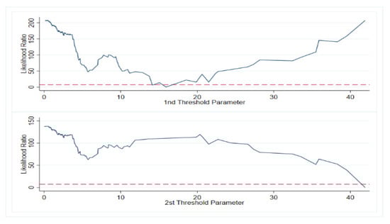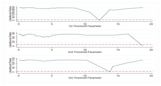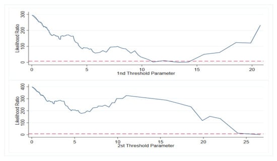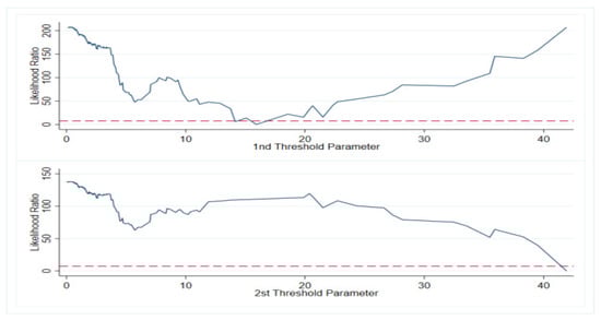 As seen in Figure 8, Figure 9, Figure 10 and Figure 11, all the threshold values were within the confidence interval, and the threshold values were real. Threshold regression analysis could be performed, as shown in Table 8.