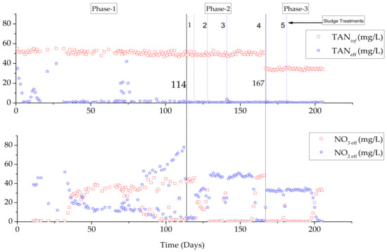 In a sludge-treatment method introduced by Wang et al. (2017) in which an FA concentration of 210 mg FA/L was used, 22% of activated sludge from a sequencing batch reactor (SBR) was taken and treated on a daily basis on the sidestream [20]. However, Wang et al.’s method has two drawbacks. First, daily sludge treatment may not be required until and unless NOB is activated in the reactor. Second, sludge treatment requires an additional batch reactor to suppress NOB.