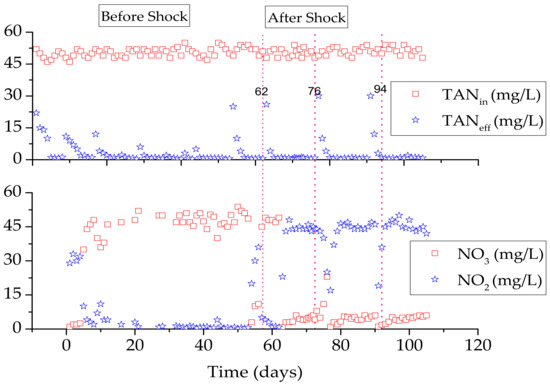 The stability of biological reactors can be changed temporarily by substrate shock and returned to an original steady-state condition within a few days of operation [11,23,24,25,26,27]. The experimental results showed that NOB are more sensitive to FA concentrations [19].
