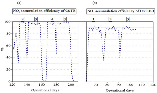 Nitrite accumulation efficiency (%). (a) The NO2 accumulation efficiency of the CSTR after sludge treatment. The numbers from 1 to 5 show the number of sludge treatments tested after NOB recovery. (b) The NO2 accumulation efficiency after substrate shocks. The numbers from 1 to 3 show the number of shocks tested after NOB recovery.