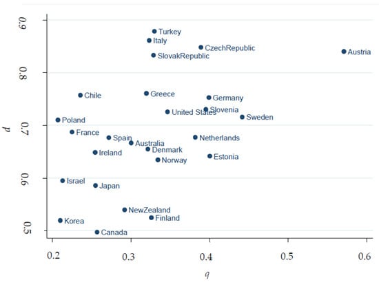 Looking at distribution, we find that the observed values range from 20.7% to 57.1%. Half of countries are concentrated in the interval (30–40%); Poland, Korea, and Israel have the lowest values—20.7%, 21.0%, and 21.3%, respectively. This means that only 20% of children whose parents have tertiary education do not achieve tertiary education; the remaining 80% graduate. Austria (57.1%), Sweden (44.2%), and Estonia (40.0%) rank bottom. Figure 1 compares p and q values for all OECD countries, outlining a moderate correlation () between these two dimensions. Countries with the percentage of individuals whose educational status does not change with respect to their parents are on the diagonal. Without loss of generality, we assume p > q. Empirical data confirm this assumption, since the mean of and was 0.69 and 0.30, respectively; and ranged between 0.497 and 0.878 and between 0.207 and 0.571, respectively, meaning that the majorization holds.