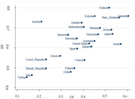 Figure 2 illustrates the empirical relationship between MI and OI, evidencing how the two rankings do not coincide. Parametric (Pearson) and non-parametric (Spearman) rank–order correlation coefficients were run with the aim of measuring strength and direction of the association between and , evidencing a moderately positive relationship (Spearman r = 0.634; Pearson r = 0.665, both n = 26 countries). Similar coefficients of both parametric and non-parametric correlations indicate that the relationship is linear and allows to conclude that MI is directly proportional to OI. However, both correlation coefficients indicate an imperfect correlation between the two rankings, and as a result, and seem to capture two partly different aspects of education. In all cases, when the two rankings diverge, further criteria are required to identify which country performs best.